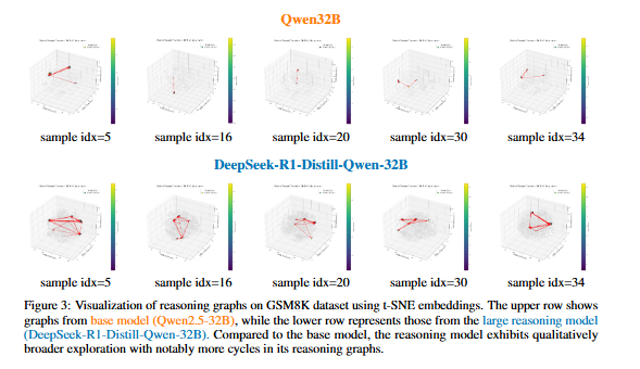 - 수학적 추론 과정(GSM8K)에서 제안하는 추론 그래프의 개념을 시각적으로 보여주는데, Qwen 베이스 모델보다 대규모 Deepseek R1 추론 모델의 내부 상태 차이를 t-SNE로 시각화하여 나타내었습니다.