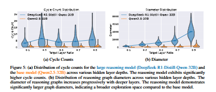 - 또한 그래프의 노드들이 더 넓은 공간에 분포되어 있으며, 이는 모델이 추론 과정에서 더 다양한 사고 상태를 탐색한다는 것을 의미합니다. 논문에서는 이를 '더 큰 지름(larger diameter)' 특성과 연결하여 설명합니다. 그래프 지름은 깊은 hidden layer에서 점진적으로 증가하는 경향을 보였습니다.