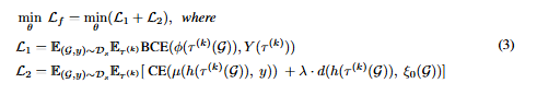 - L2은 각각 변환된 그래프의 표현을 사용하여 Expert models의 분류기가 본래 그래프의 구성과 해당 클래스를 정확하게 예측하도록 최적화하는 Cross Entropy 기반의 예측 정확도 (좌측)항과, Expert model들이 표현 사이의 거리 함수 (Frobenius norm)의 패널티 강도를 하이퍼파라미터로 조절함으로써 공통된 표현 공간으로 정렬되도록 강제하는 (우측)항의 합으로 구성되어 있습니다.