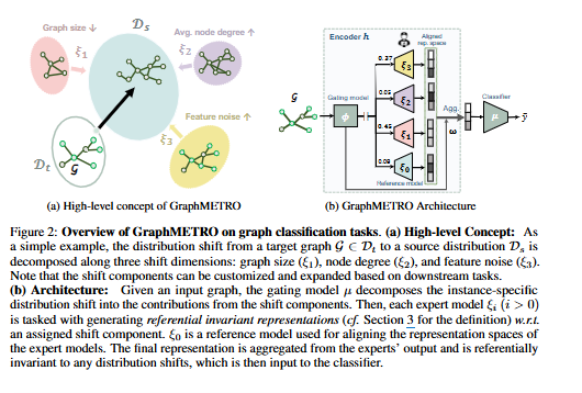 - Fig 2는 실제 그래프 데이터에 존재하는 복잡한 분포 변화를 어떻게 접근하는지 개념적으로 설명하기 위한 GraphMETRO 모델의 핵심 개념과 아키텍처를 보여줍니다.