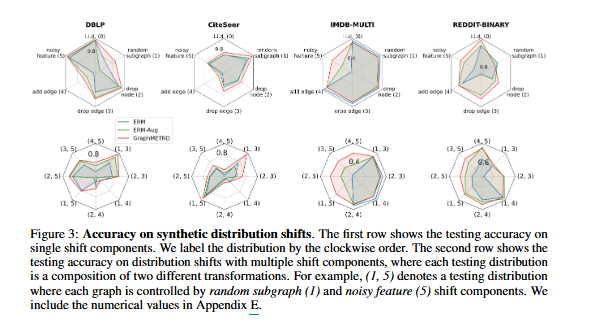 - GraphMETRO는 GOOD 실세계 벤치마크 데이터셋 및 합성 데이터셋에서 기존 방법들 대비 좋은 성능을 보였습니다. Fig 3의 합성 데이터셋 실험에서의 각종 성능 지표를 통해, 전반적으로 GraphMETRO (빨간색 선)는 대부분의 단일 및 다중 분포 변화 환경에서 ERM(파란색 선) 및 ERM-Aug(초록색 선)보다 높은 정확도를 보여주거나 최소한 동등한 성능을 유지합니다. 이는 GraphMETRO가 다양한 유형의 복잡한 분포 변화에 대해 더 강력한 일반화 능력을 가지고 있음을 시사합니다.