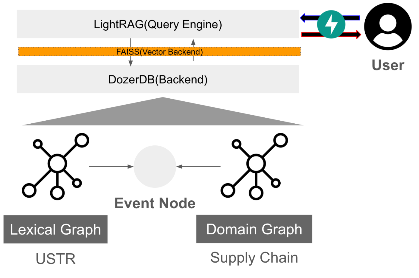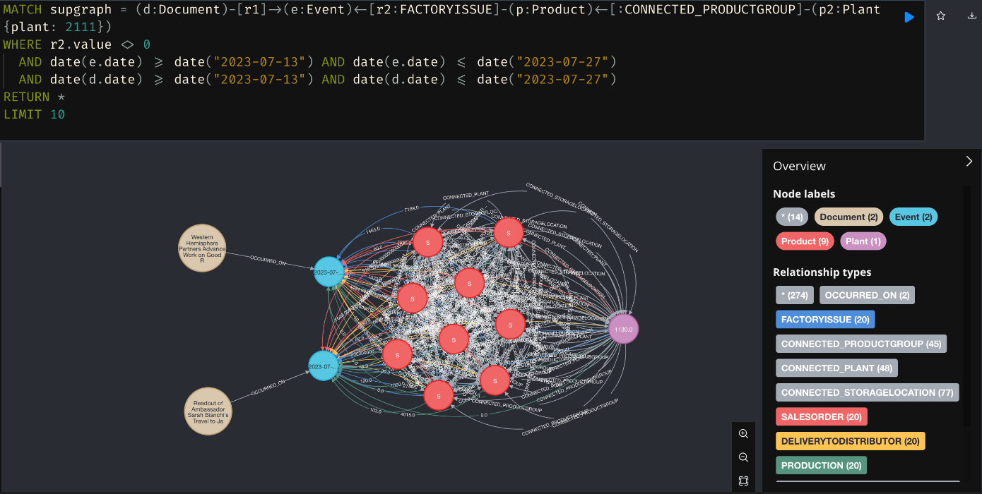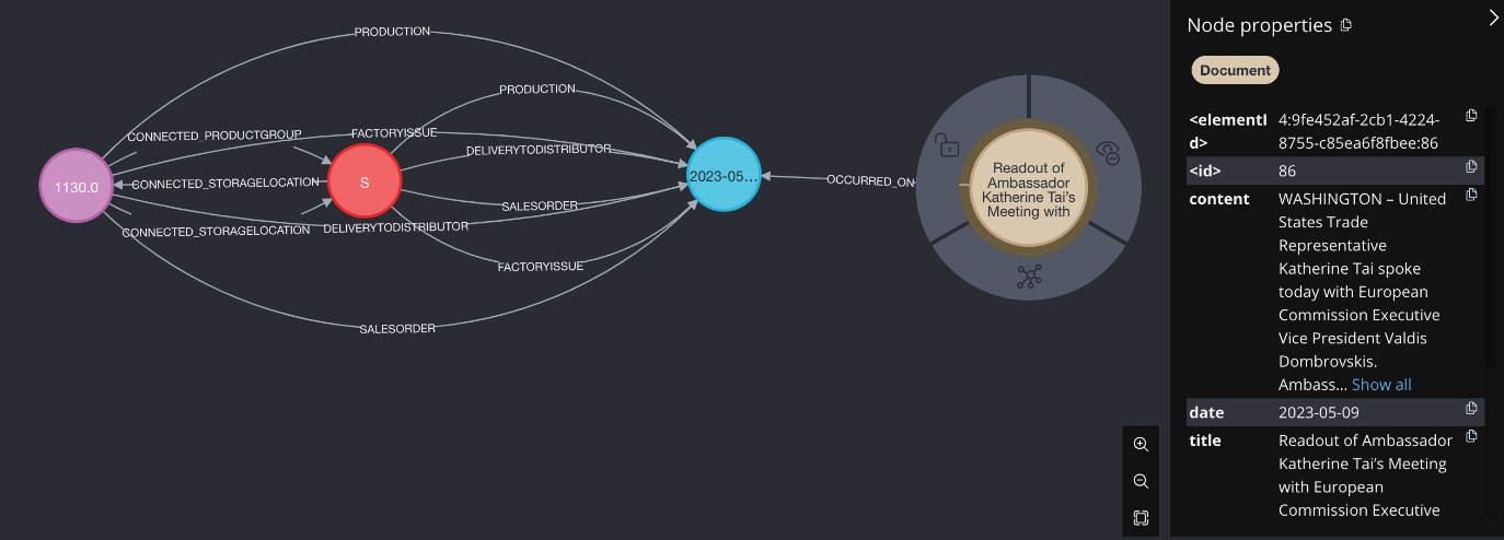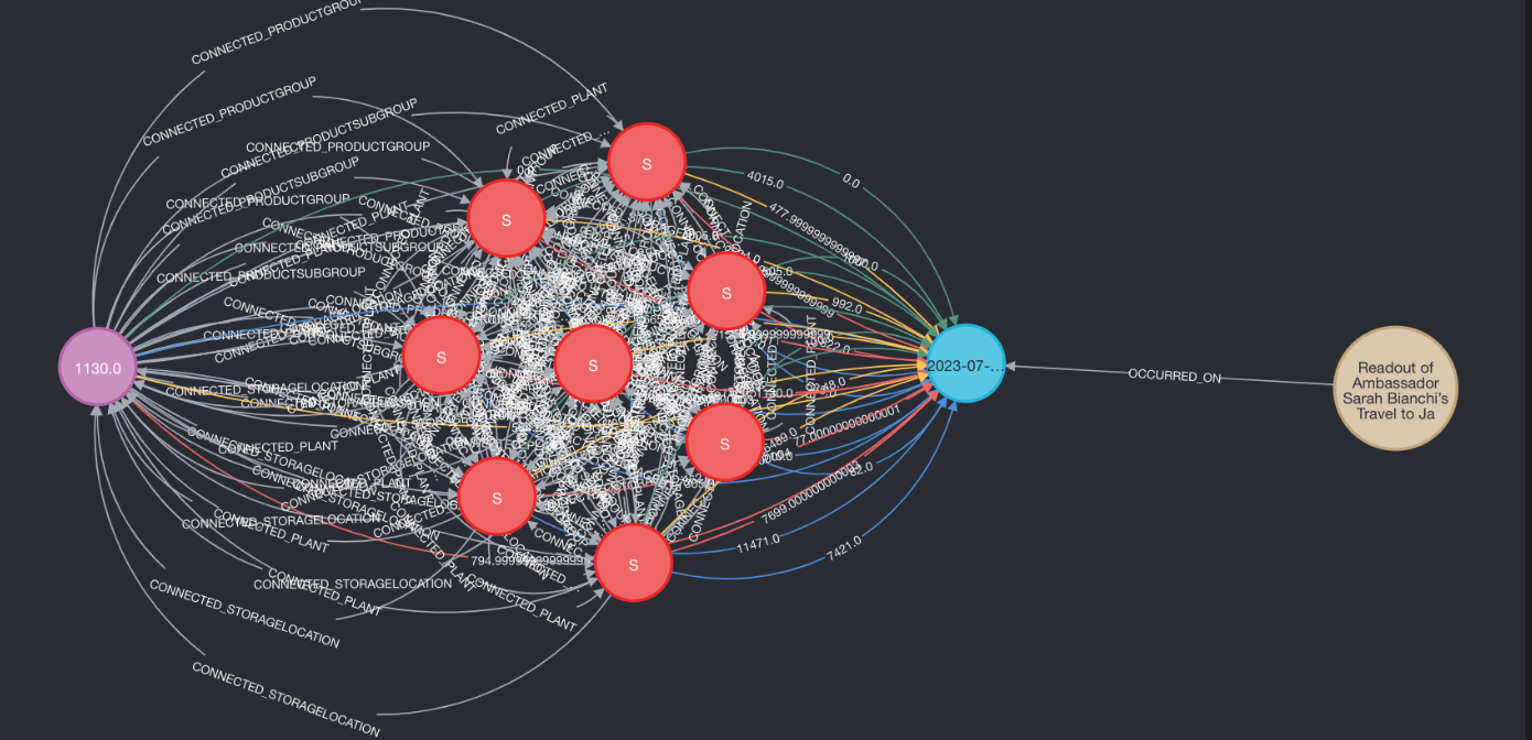 각각 USTR document graph 와 supply chain graph 가 Event 라는 시간 기준을 담고있는 노드기반으로 연결됩니다. 스냅샷과 유사합니다. 이를 통해 특정 날짜에 발표가 있었을시, 해당 날짜 기준으로 distribution , sales order 등 supply chain에 무슨 변화가 있었는지를 볼 수 있습니다. 반대로는 supply chain에서 비정상적인 패턴이 발생했을시, 이후에 어떤 발표가 있었는지를 살펴볼 수가 있기에, 이 스키마는 상관성에서 더 나아가 인과성까지 유추할 수 있는 기능을 가집니다.