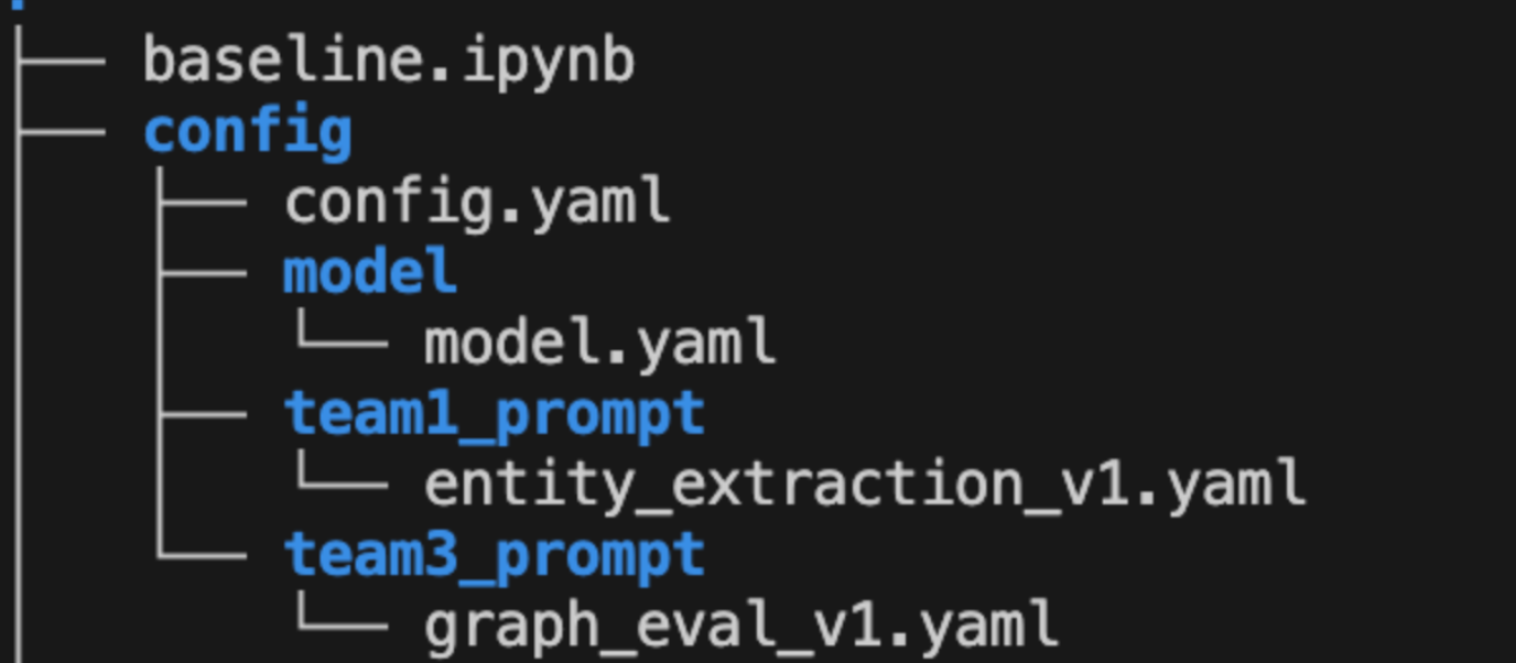아래 그림은 현재 프롬프트 관련 tree입니다. hydra 의 default config 를 가장 상단 폴더의 config.yaml 에 설정해주고, 저희가 활용할 모델을 관리해주는 model config , team1과 3분들이 활용할 각각의 prompt.yaml 이렇게 구성되어 있습니다. 뜬금없이 model config가 나와서 의아하실 수 있습니다.