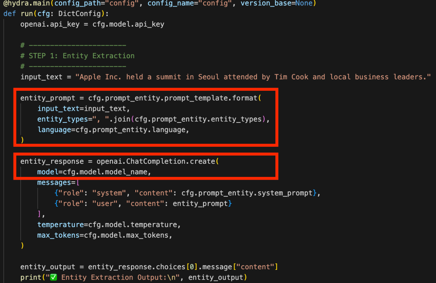 지금 멘토링에는 단일 모델 openai 만을 활용하지만, 추후에 멘티분들이 이 코드를 활용해서 타모델들 (open & closed model)별로 이 프롬프팅들을 적용할 수 있는 확장성을 고려해서 model 또한 config 범주로 넣어줍니다. 관련해서 자세한 내용은 테디노트님 영상에서 각 모델별 NER 결과 그리고 LLM as judgement 부분을 보시면 이해가 되실겁니다.