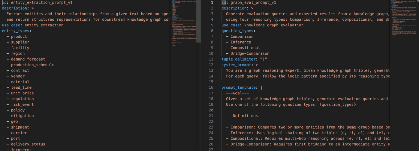 좌측이 entity extraction 을 위한 프롬프트이고, 우측이 entity(knowledge graph) 기반으로 evaluation data를 만드는 프롬프트 입니다.좌측은 엔티티 타입들이 눈에 띕니다. LLM에게 청크 내 특정 엔티티들만 추출해야한다라는 암묵적인 룰을 명시해준거죠.