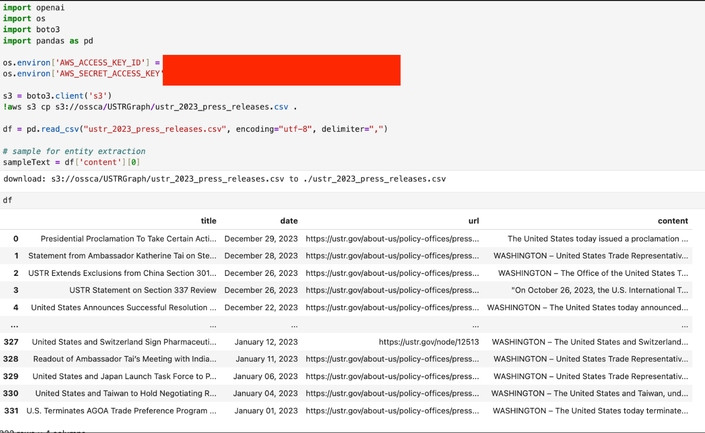 작업을 위해 데이터셋때문에 골치아플 일이 생기는 일을 방지하고자 S3 에 USTR 데이터셋을 적재해놓았고, 팀1,2,3 모두 동일한 환경에서, 리소스에 구애받지 않고 활용할 수 있게 코랩으로 베이스라인을 전달했습니다. 이전 주차에서 언급한 USTR 데이터셋 3개 중 press release 를 활용합니다.
