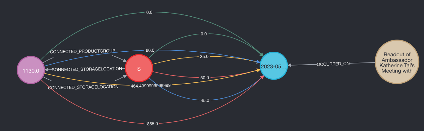 위 서브그래프는 5월 9일에 USTR 워싱턴에서 발표했을때 때마침 1130 에 위치(아마도 국가인데 익명화한거 같네요)한 공장에서 생산된 Group S 에 속한 Product 가 각각 35를 유통 , 45의 공장 이슈 50개가 판매되었네요. 보기만해도 복잡하네요.