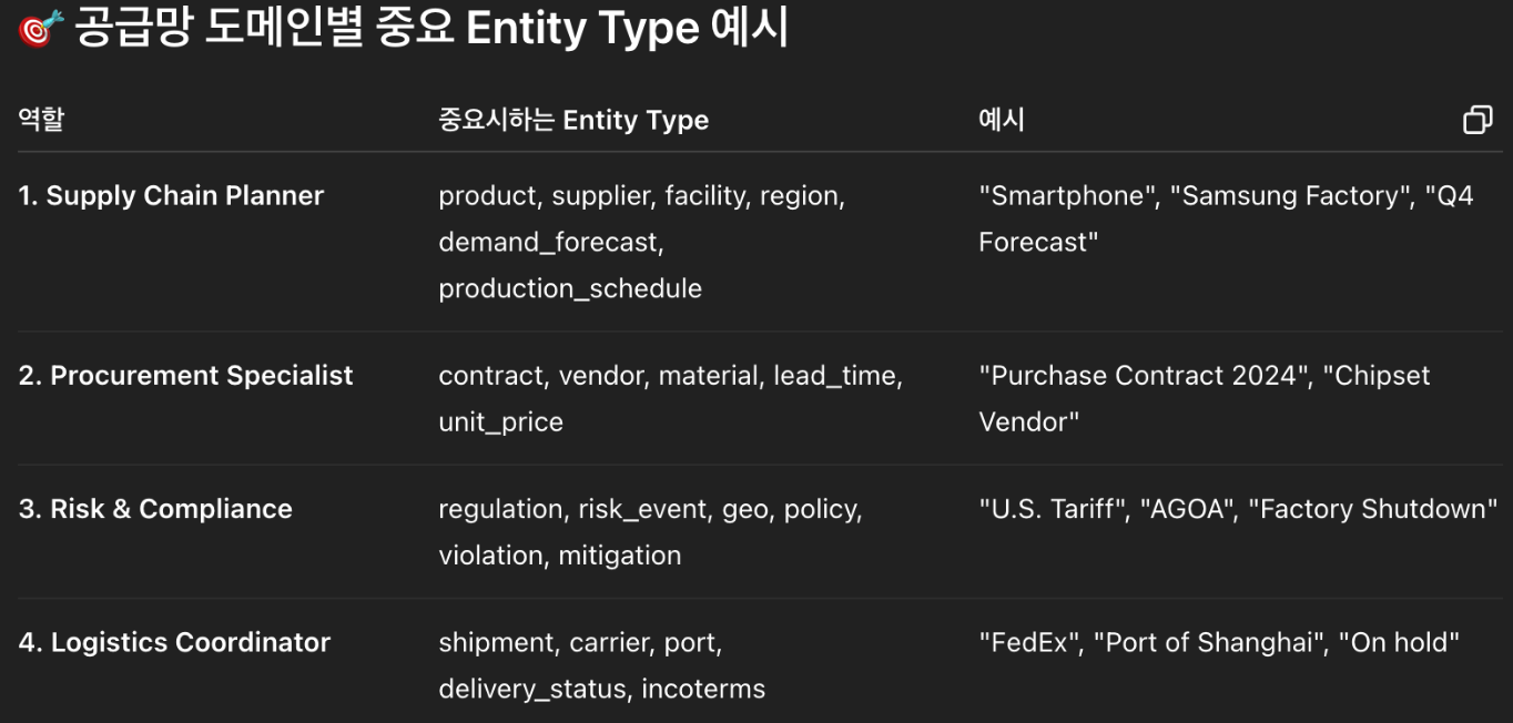 동일한 데이터지만, 각 직군들이 바라보는 관점이 다를지를요. 때문에, 샘플 데이터셋 하나를 예시로 들고 LLM에게 중요한 엔티티를 추출해달라고 요청합니다. 아래 그림이 그 결과구요. 보시다시피, 각기 다른 entity type들이 결과로 나옴을 확인할 수 있습니다. 여기에서 다시 Team1의 과업으로 들어가면, 이 중요시하는 Entity type과 역할들이 NER prompt 의 핵심 재료라고 할 수 있습니다. 제가 늘 강조하는 prompt 에 business domain을 입혀야한다라는 것의 예시입니다.