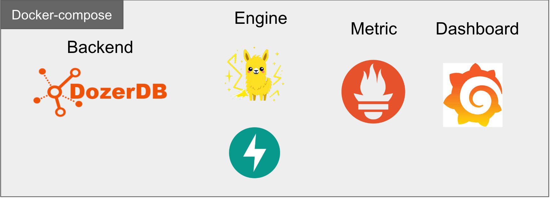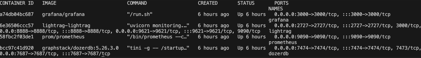 도커 컴포즈는 다음과 구성되어 있습니다. 기존에는 neo4j <-> lightrag server만 있었지만, 모니터링을 위해 프로메테우스와 그라파나를 추가했습니다. Team2에서 쿼리를 분석하고 튜닝하려면 모니터링 도구가 필요하니깐요. 아래는 docker compose up 시 동작하는 컨테이너들입니다. 지금보니, 예전에 해봤으니 비슷할거 같은데? 별거 아니겠구나 했던 저를 반성하게 되네요. 굉장히 많은 시행착오가 있었습니다.