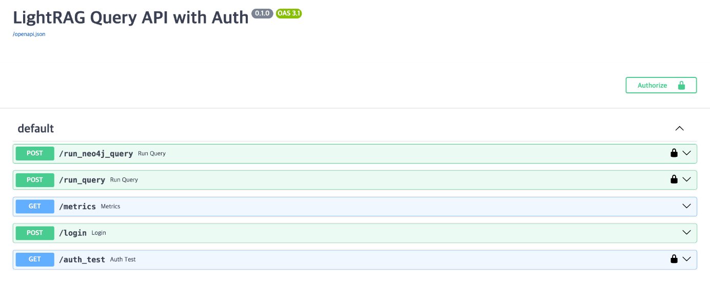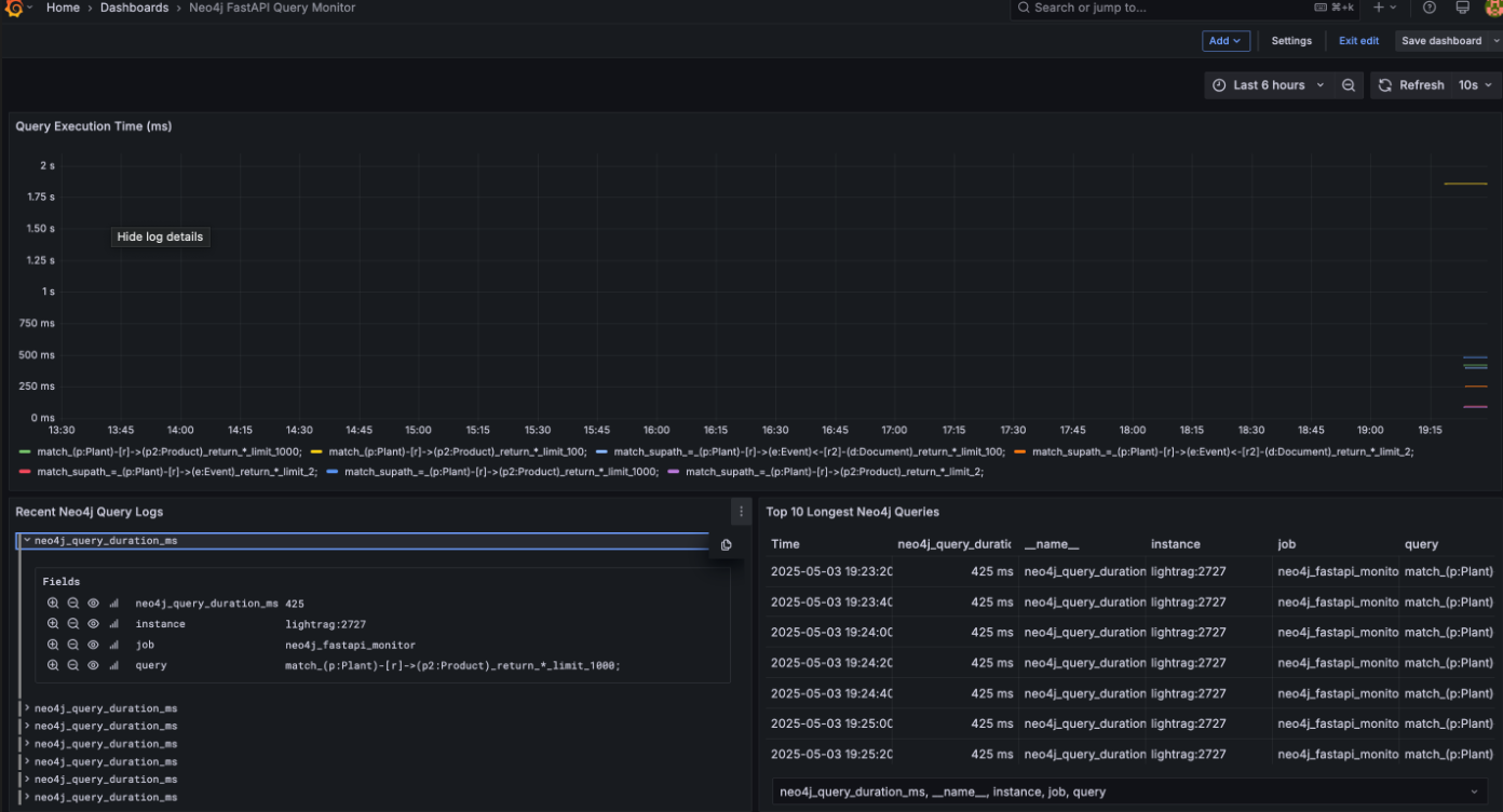 사실 모니터링 툴을 만들지 예상못했습니다. 그 이유는 query.log 가 DBMS 동작시 log폴더에 있어서 당연하게 찍히고, 파싱도 문제 없을줄 알았다. 하지만, 그렇지 않았음. 때문에 show transaction 내부 프로시저를 활용하거나 자체적으로 api swagger 에서 쿼리 입력하면 로깅해서 프로메테우스로 전달하는 방식을 택해야했습니다. show transaction을 로깅하다보면 cpu 병목이 걸릴거 같다라는 생각에, 이벤트 발생시 해당 이벤트만 수집하는 형태가 적합하다 생각해서 다음 2개의API를 만듭니다.run_neo4j_query(dozerdb) , run_query(lightRAG engine)