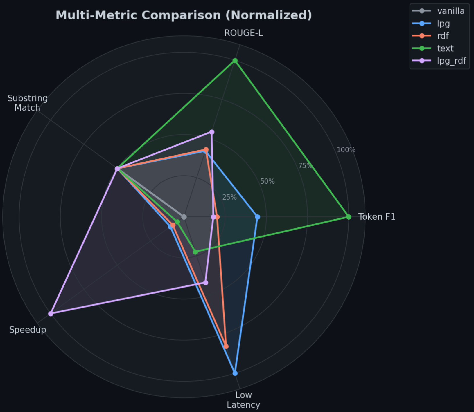 2. Efficiency — RDF 토큰의 58%가 URI prefix 낭비, LPG의 None 노드 10% 낭비. Token당 information density가 성능을 결정.
