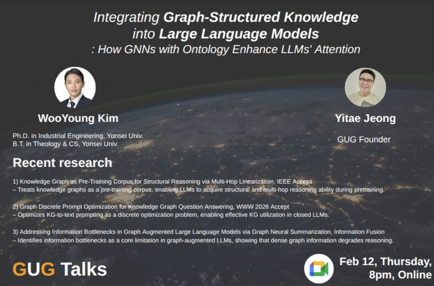 4.바로 연세대학교에서 '그래프 구조 지식과 거대언어모델(LLM)의 통합'을 연구하신 김우영 박사님입니다! 이번 세미나에서 박사님은 AI의 논리적 추론(Neuro-symbolic reasoning)과 그래프 증강 언어 모델(Graph-augmented LLM) 분야의 깊은 통찰을 아낌없이 나눠주실 예정입니다.
