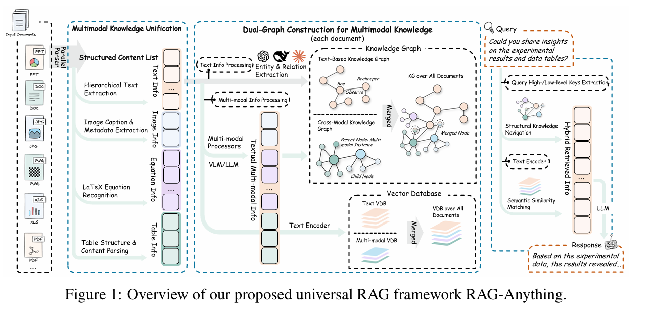- 멀티모달 RAG의 핵심은 기능의 확장이 아니라 문서의 의미 구조를 보존하는 지식 표현 방식의 변화에 있습니다. 이를 위해 RAG-Anything은 세 가지 기술적 접근을 제안합니다.