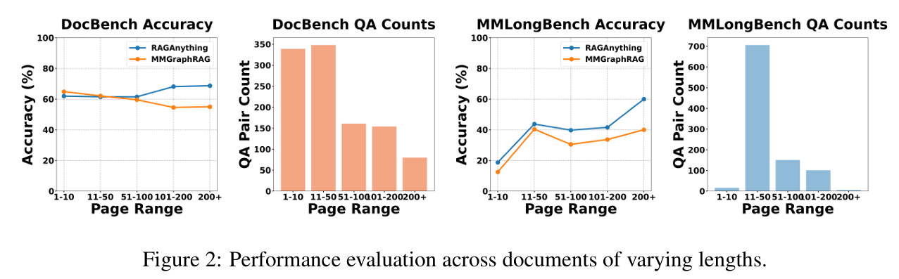 - 이 접근의 강점은 문서의 길이가 길어질수록 더욱 분명하게 나타납니다. 수십 페이지를 넘어 수백 페이지에 이르는 문서에서는 기존 RAG가 필요한 정보를 놓치는 경우가 많았지만, RAG-Anything은 문서 전체의 구조를 유지한 상태로 탐색하기 때문에 성능 저하가 상대적으로 적습니다. 실제로 DocBench와 MMLongBench 벤치마크에서 기존 최신 기법 대비 우수한 성능을 보이며 이를 입증했습니다.