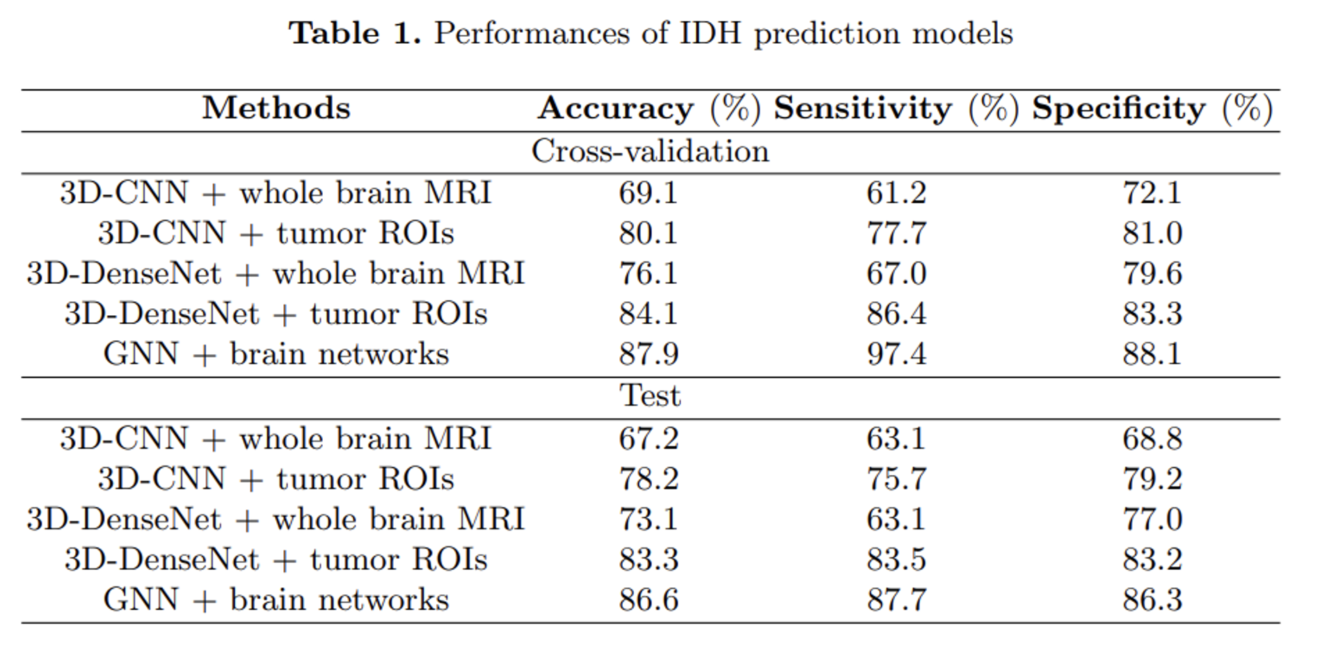 - Tumor voxel을 입력으로 받는 비교 벤치마크 네트워크(3DCNN, DenseNet)의 성능이 전체 MRI를 받은 성능보다 높게 나왔으며, 이를 통해 local region을 넘어서 확장된 뇌 네트워크의 잠재적인 bias가 학습 과정에서 활용되고 있음을 확인해볼 수 있습니다.