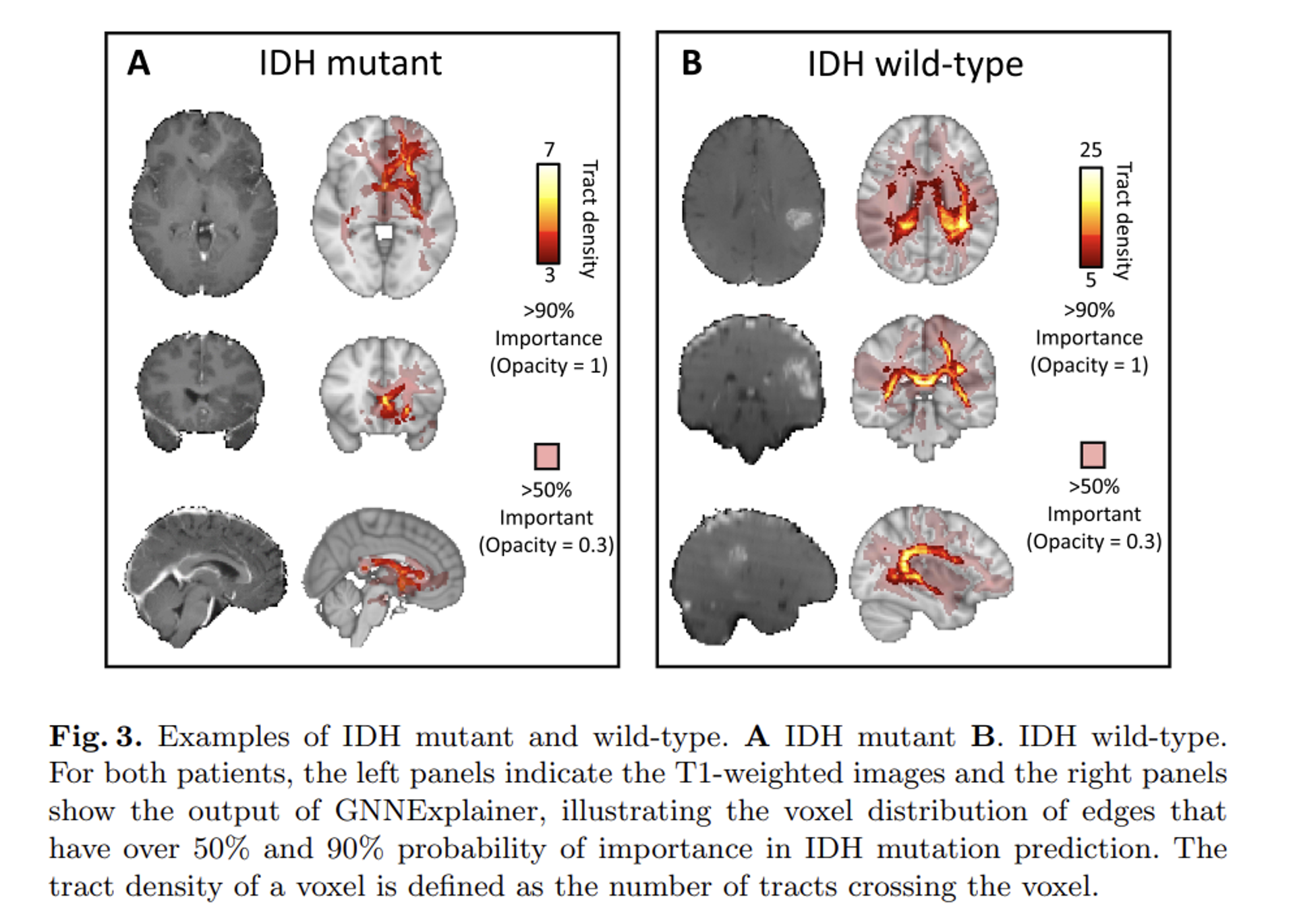 - 전체적으로 wild-type에서 GNN 모델이 포착해낸 더 넓은 엣지 상의 종양 분포도를 효과적으로 확인해볼 수 있으며, 그로부터 IDH mutant Glioma의 광범위한 뇌 네트워크 침입 tract 정보를 연관지어 포착할 수 있는 GNN 방식의 장점을 확인해볼 수 있습니다.