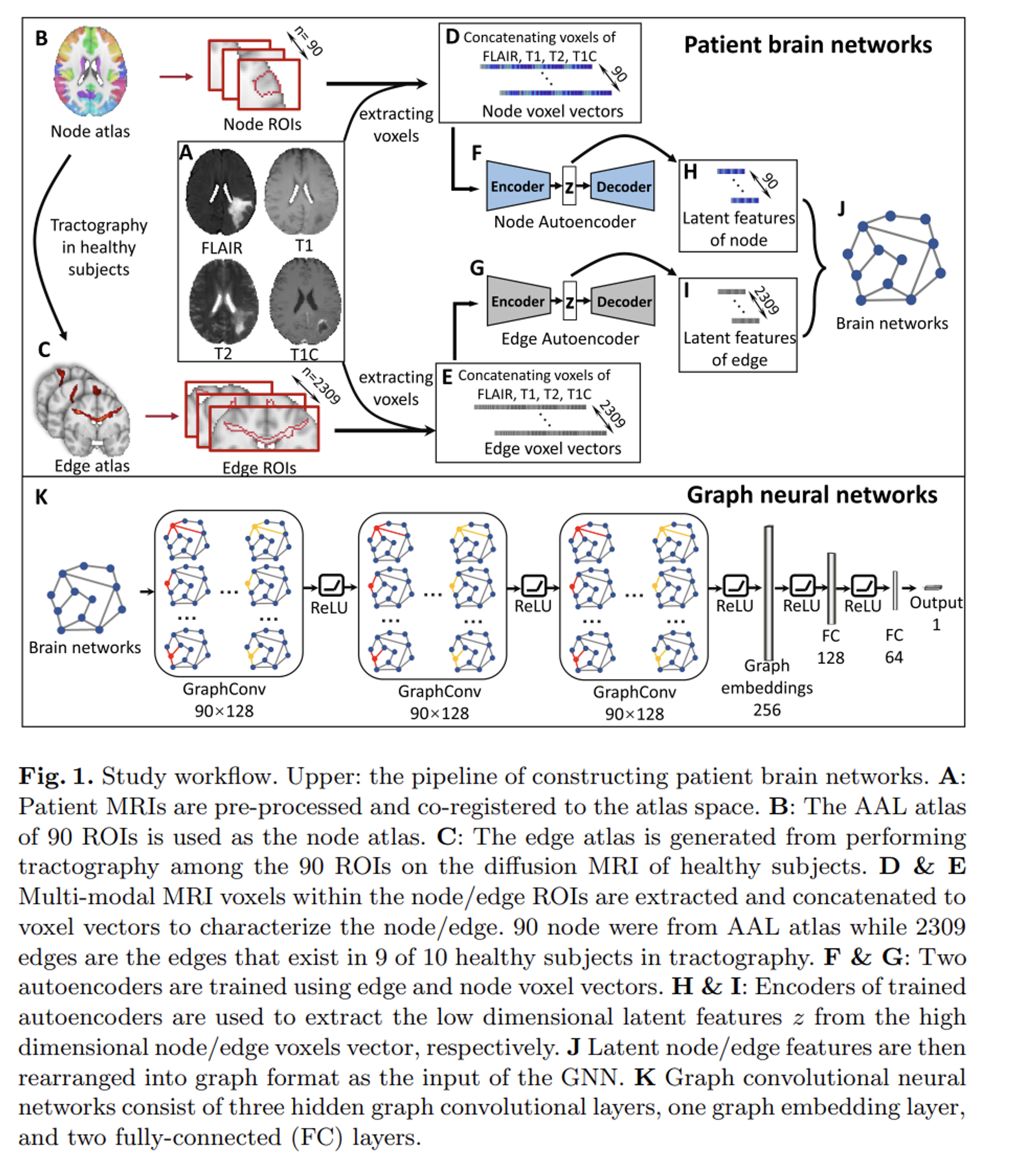 - 건강한 환자의 뇌 아틀라스 (AAL Atlas)를 템플릿으로 사용하여 90개 영역의 노드 ROI (Fig 1B의 색상부분)와 위에서 추출된 복셀들을 concatenate하여 Node voxel vectors를 생성합니다.