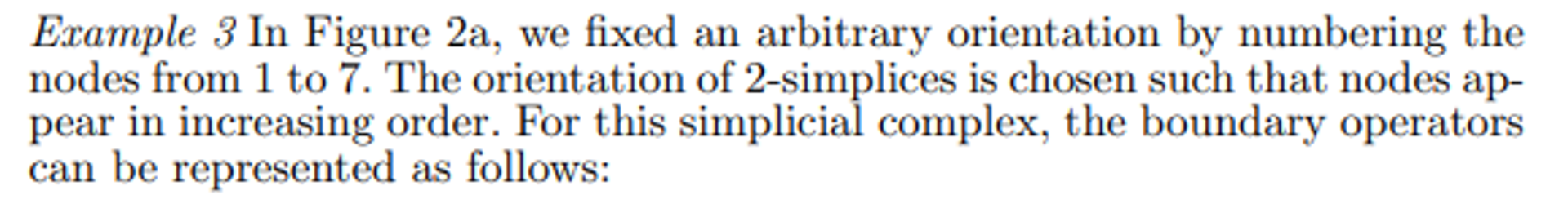 - Fig 2 (a)의 화살표가 해당 simplices의 방향성을 나타냅니다. 예를 들어, 1-simplex (엣지) 방향성은 노드 레이블 1 -> 3, 1 -> 4, 3->4 로 오름차순을 따라 지정되어 있으며, 2-simplex (삼각형) 역시 노드 레이블 1 -> 3 -> 4 순서로 rotational하게 정해져 있습니다.