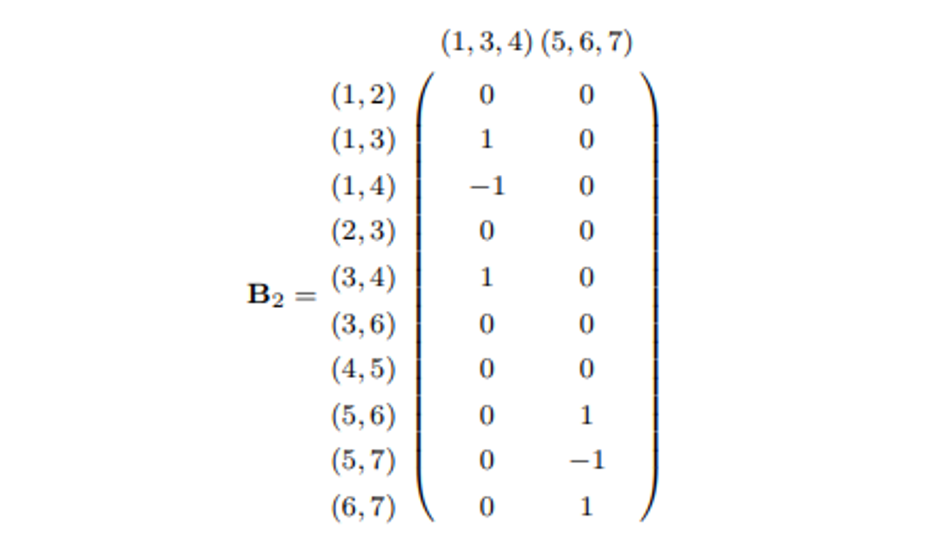 - (+,-) 의 부호는 두 simplices 사이의 in-flow 혹은 out-flow (for B_1), 또는 방향성 일치 여부 (for B_2)를 나타냅니다.