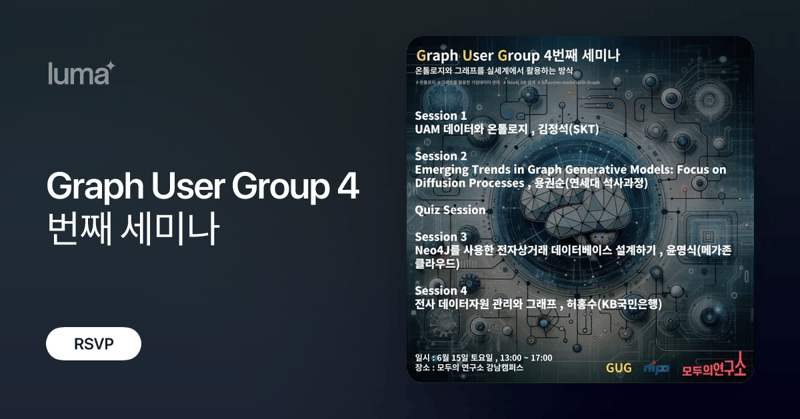 추가로, Neo4j 를 활용한 DB 설계 그리고 Graph Generation Model 중 하나인 Diffusion model 계열의 트렌드에 대해 알아보며 실무와 학계 경계없는 알찬 주제들로 구성해보았습니다. 그래프에 대한 트렌드를 알아가며 보람찬 주말 오후를 보내보는건 어떠실까요?! 행사 때 뵙겠습니다 😄