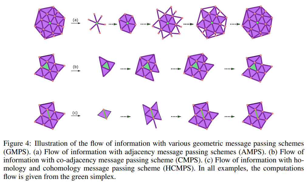 - 간략하게, Fig 4에서와 같이 노드, 엣지, 그 이상의 Simplex 요소들을 Face & Co-Face 관계를 인코딩하는 (C0-)Boundary operator로부터 메세지를 전파하고, 순차적으로 타겟 요소를 업데이트하는 방법을 정의합니다. 구체적인 3가지 알고리즘 (AMPS, CMPS, HCMPS)들은 기존 CXN (Cell complex networks)의 알고리즘을 Simplicial complex에 맞추어 변형하여 사용합니다.