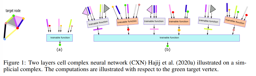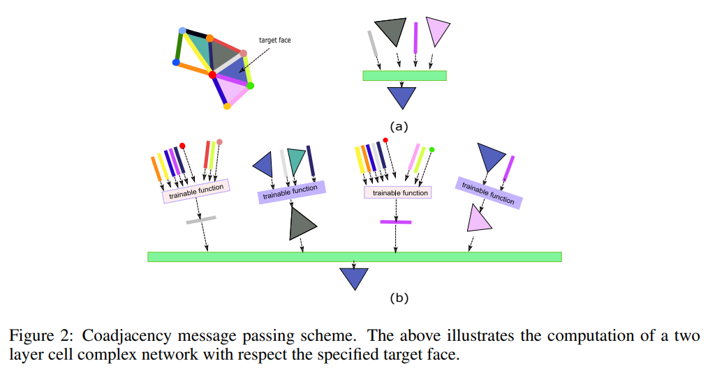 - Fig 1은 초록색 타겟 노드를 업데이트 하기 위하여 해당 Simplicial complex의 인접 요소들을 모두 집계하는 방법을 보여주고 있습니다.