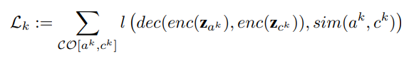 - 모든 co-face 교집합 요소들에 대하여, 각각의 요소 a, c의 표현 벡터 및 user-defined similarity 간의 loss를 계산합니다. 다음 loss 함수 (l)은 아래의 다양한 SCA 방법에 대한 선택으로 결정되며, 전체 Loss는 다음 L_k의 합산 형태로 정의합니다.