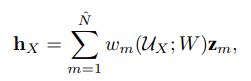 - 인코더 Enc 함수로부터 구해진 표현 벡터 z를 학습하여 표현 임베딩 h_X을 얻어내는 방법에 대하여 가중 합 형태로 아래와 같이 정의합니다.