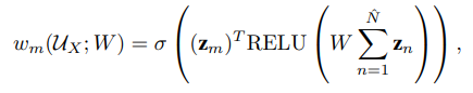 - 가중치로 정의되는 w_m은 Simplicial embedding (U_X)과 학습 파라미터 행렬 W로써 정의됩니다. 구체적으로, 다음 가중치는 아래와 같이 정의합니다.